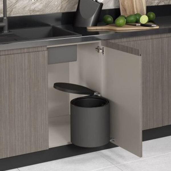 Ronde afvalemmer geschikt om te plaatsen in de keukenkast achter de deur. Zodra u de deur opent, opent de deksel automatisch. De afvalemmer past in een keukenkast met een breedte van minimaal 400 mm. De ronde afvalemmer is uitgevoerd in de kleur antraciet.