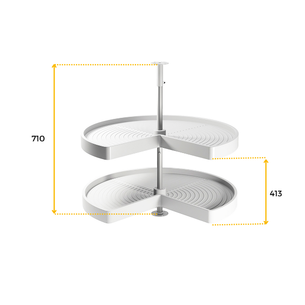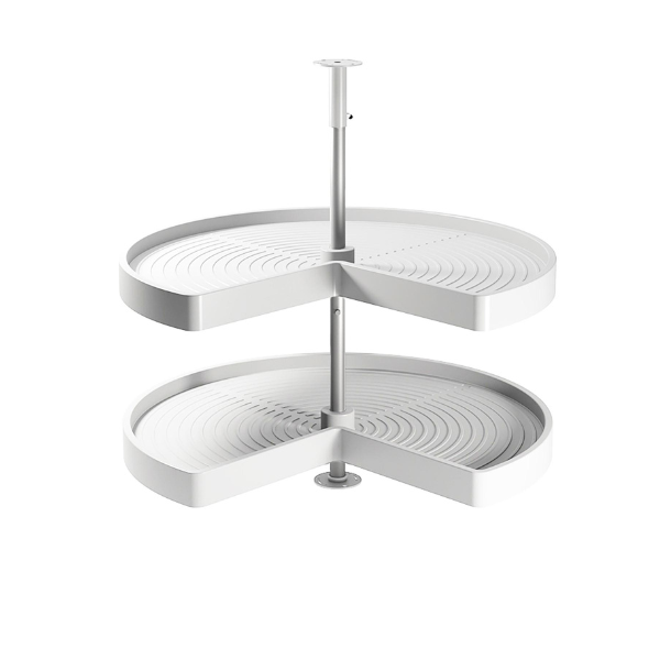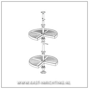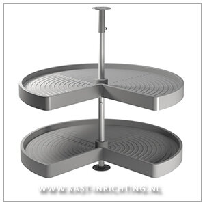 Hoekkastsysteem met driekwart roterende plateaus die speciaal ontworpen zijn om optimaal de ruimte te kunnen benutten in L-vormige hoekkast in de keuken.