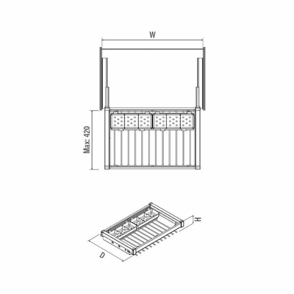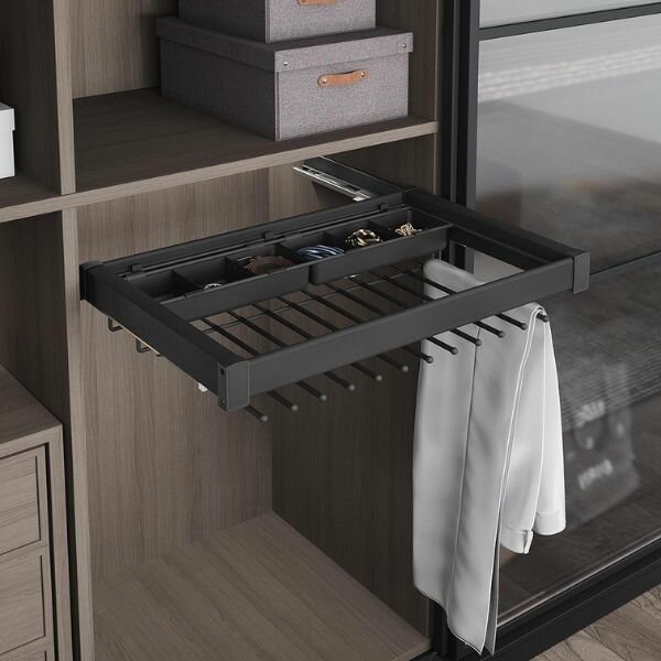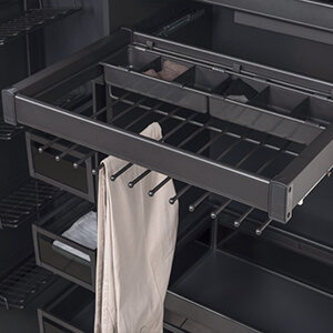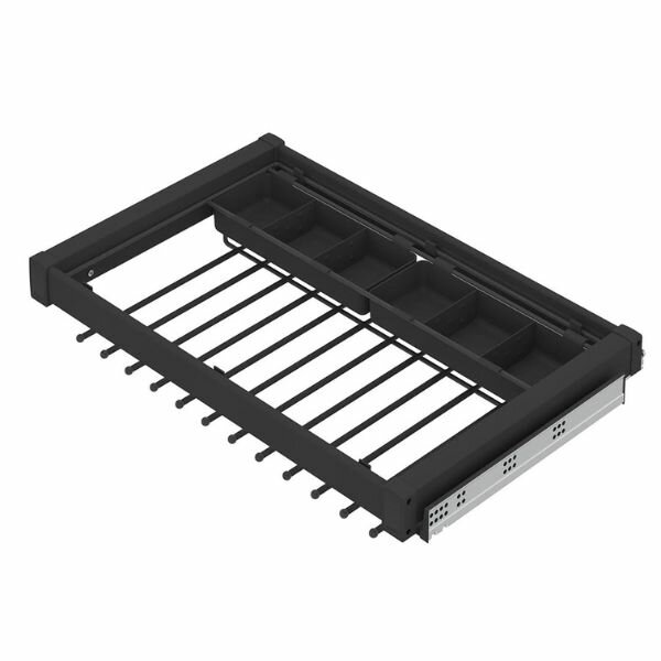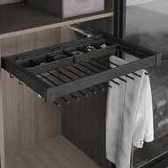 Deze luxe uittrekbare broek- en riemhouder is geschikt voor 8/10/12 of 14 broeken, afhankelijk van de gekozen breedte. De vakverdeling (6 vakken) in het uittrekelement kan gebruikt worden voor het opbergen van riemen en/of stropdassen.